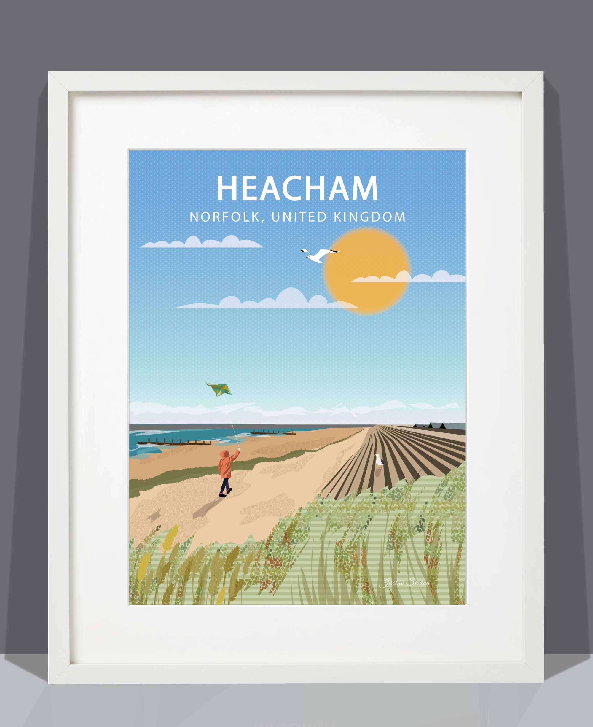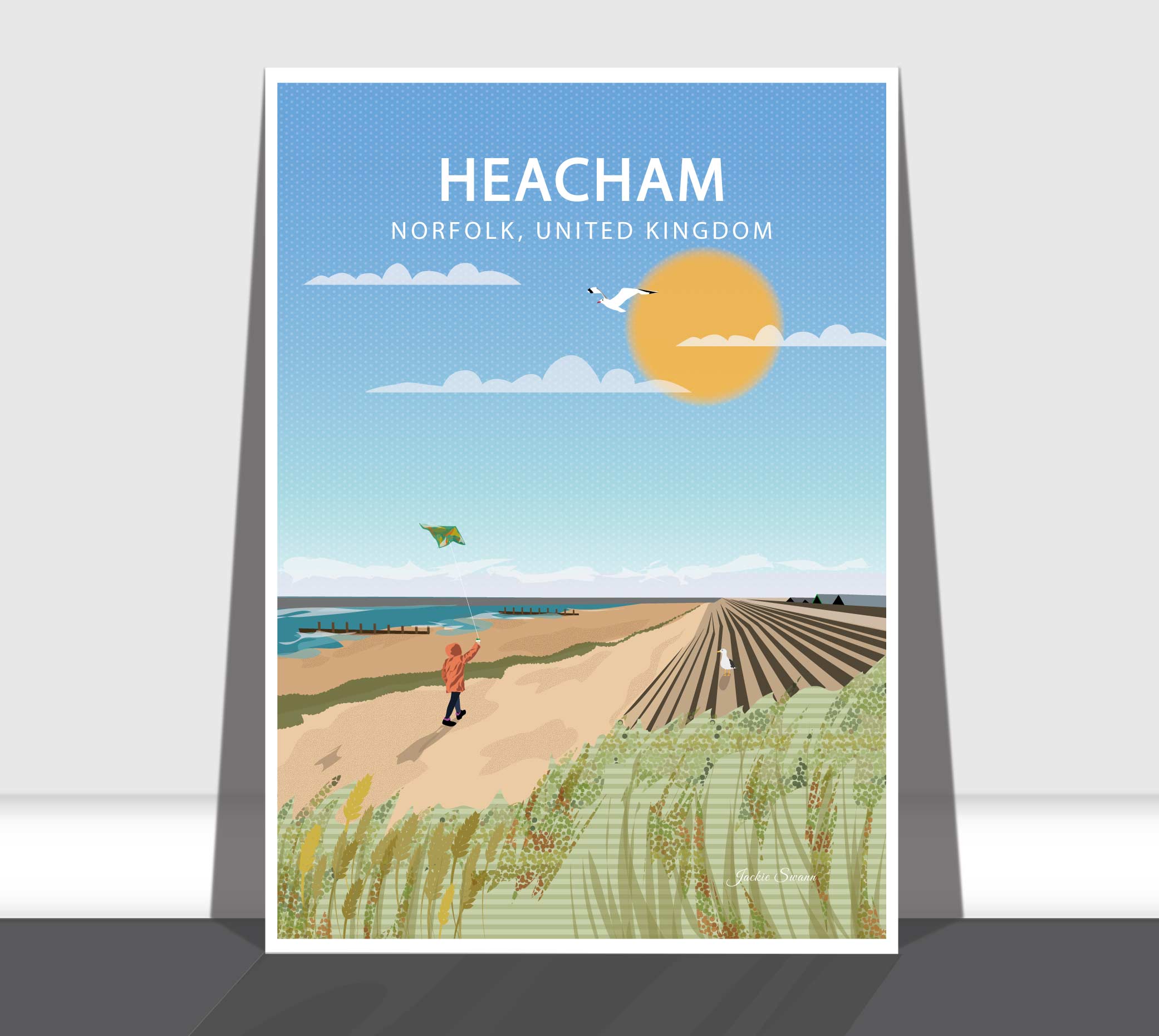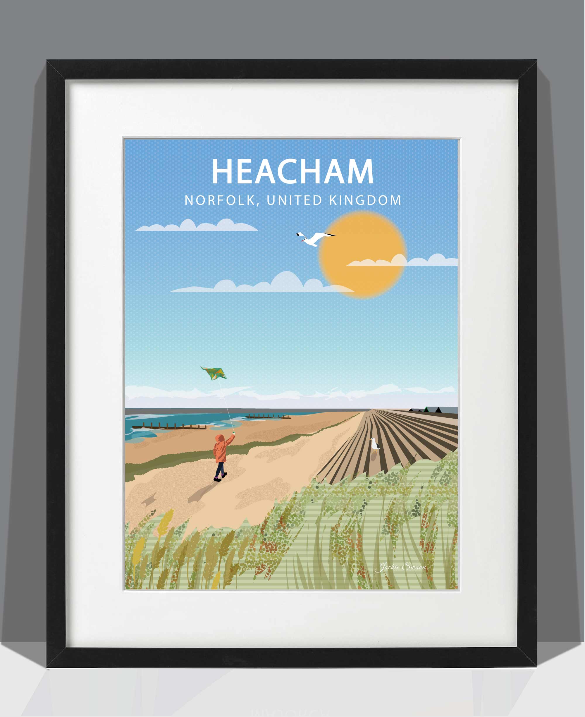 Capture the calm and coastal beauty of Heacham with this illustrated art print inspired by one of Norfolk’s most tranquil seaside villages. Nestled along the west-facing coast, Heacham is known for its wide sandy beaches, glowing sunsets over The Wash, and its relaxed, unspoilt charm.