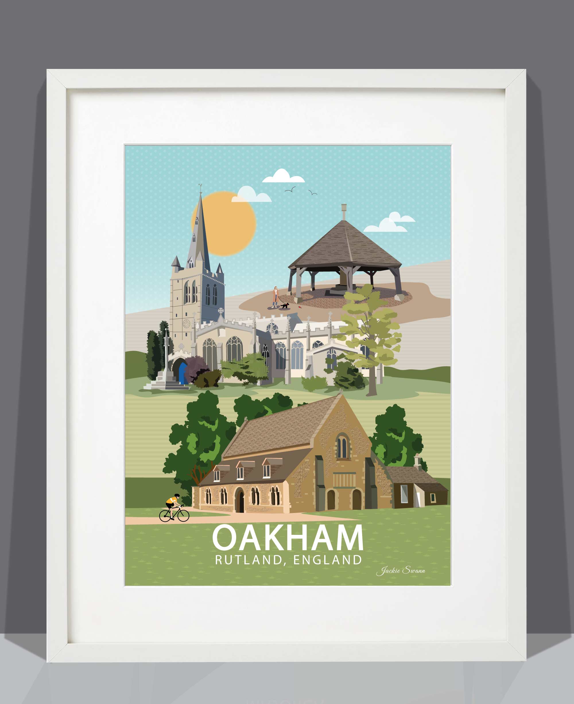 Celebrate the charm of Oakham with this detailed illustration capturing the character of Rutland’s much-loved county town. Known for its historic streets, independent shops and welcoming market square, Oakham is a place where traditional English market-town life still thrives.